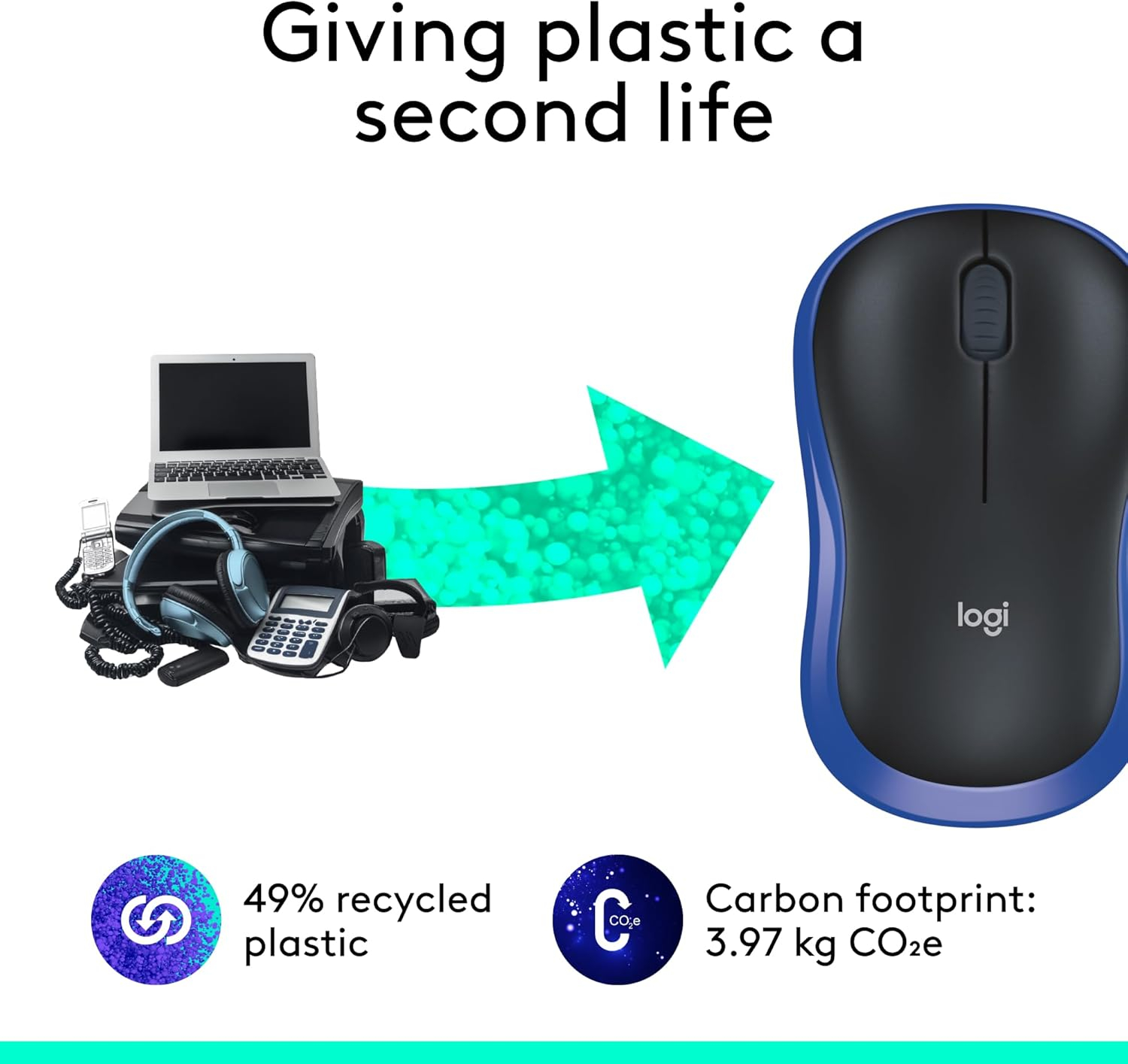 - The plastic parts in M185 include certified post consumer recycled plastic (77% for black and 49% for Charcoal/Grey, Black/Blue Glossy & Black/Red Glossy (6))